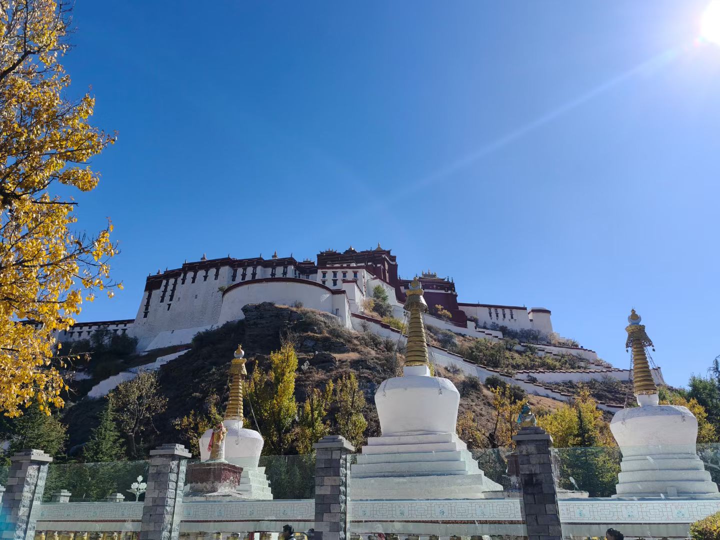 布达拉宫在秋阳里浸成一座金顶圣殿,红墙映着黄澄澄的秋树,山脚下的宗角禄康公园,湖面飘着落叶,倒映着宫墙的影子,像把整个秋天都装进了水里。